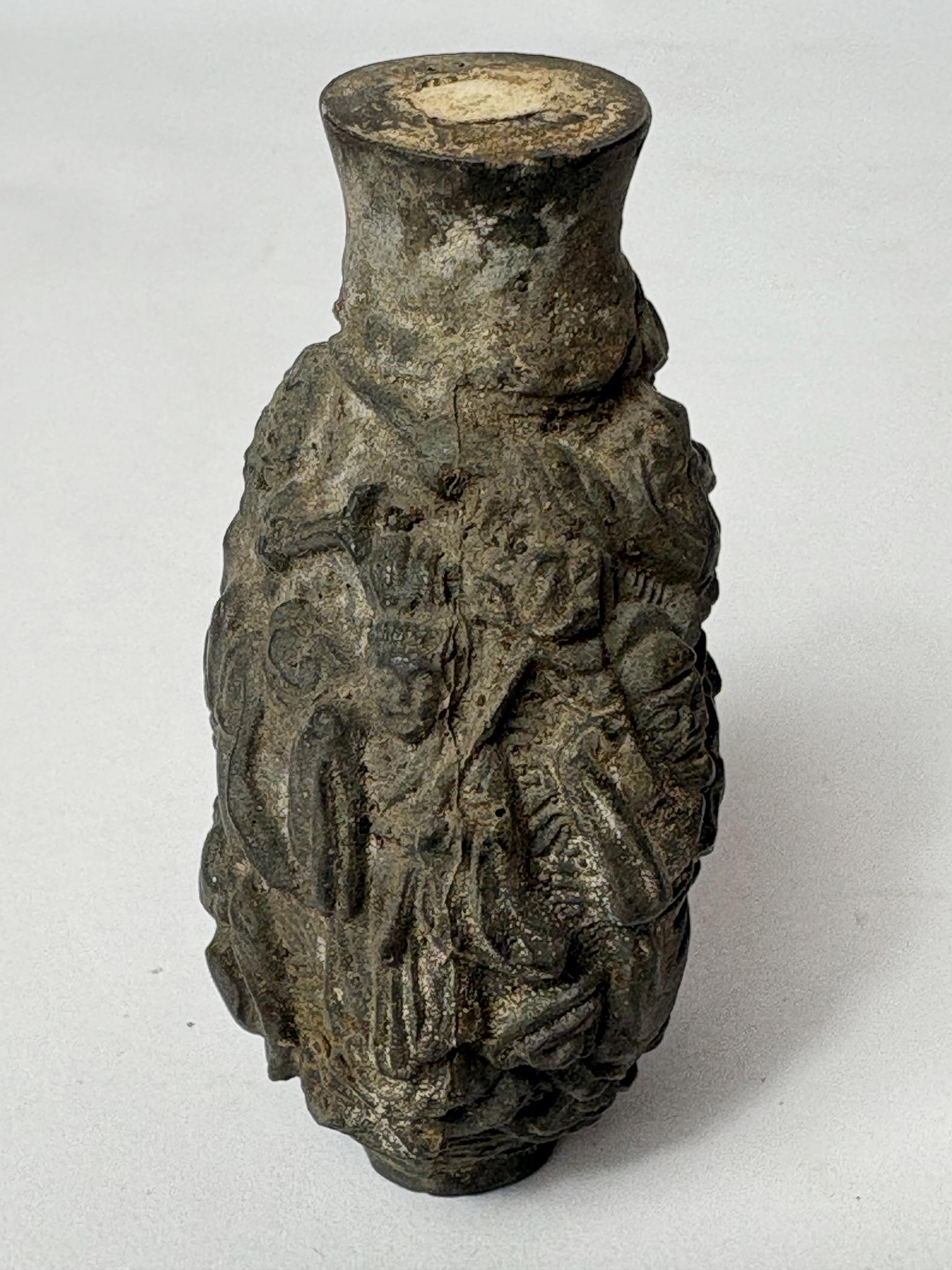 A striking Chinese snuff bottle form, richly worked in high relief with a continuous scene of robed figures evocative of Daoist Immortals and scholar legends surrounded by flowing drapery, waves and rockwork. The piece has a deep, timeworn patina that highlights the sculptural carving and makes it a superb cabinet display object for collectors of Chinese antiques and Asian art.
