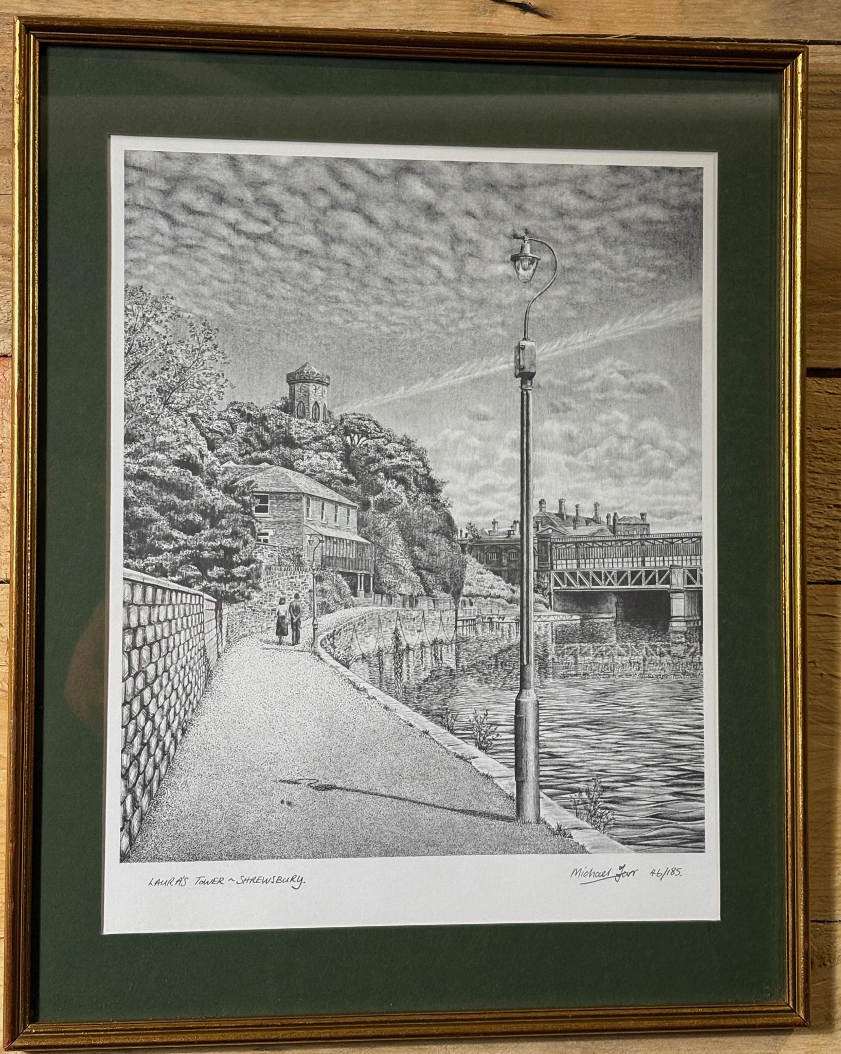 A finely detailed limited‑edition print of Shrewsbury’s famous Laura’s Tower above the River Severn. Hand‑signed “Michael Farr” and numbered 46/185, with the title inscribed to the lower margin. A classic view taking in the riverside walk, lamp standard and bridge with the tower on the castle motte.