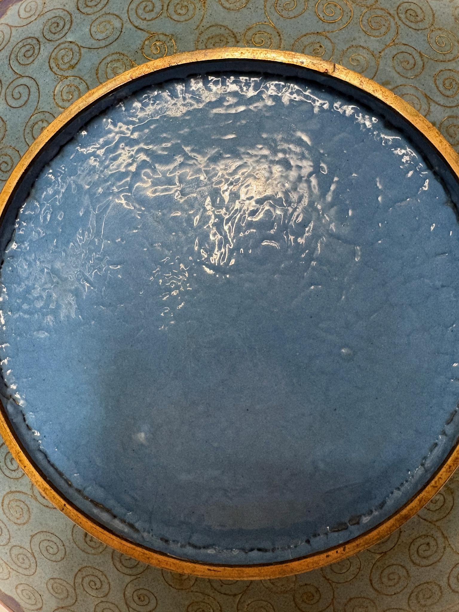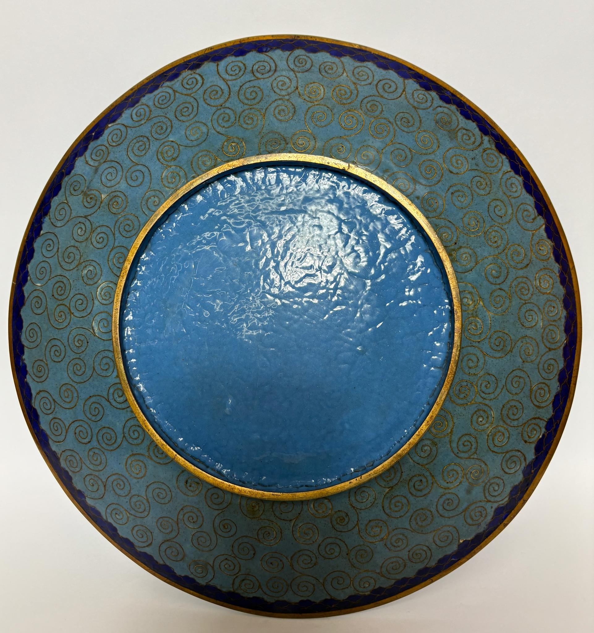 A superb late‑19th‑century Japanese cloisonné enamel wall charger, Kyoto school, circa 1890–1910. The copper body is worked in exceptionally fine gilt wires with a fan‑shaped cartouche of chrysanthemums, bird and butterfly on a sky‑blue ground, framed by a luxurious brocade of geometric and floral patterns. Reverse with pale blue counter‑enamel decorated with cloud‑scroll spirals; original gilt rim. A striking, exhibition‑quality example of Meiji shippo-yaki made for the Western market.