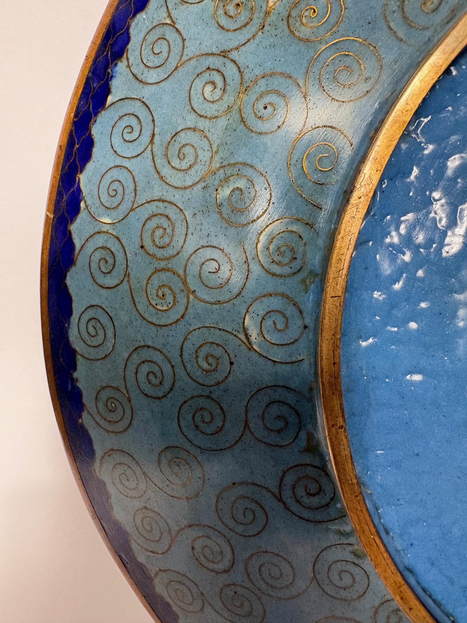 Context: Cloisonné (shippo-yaki) became one of Japan’s most admired export arts in the Meiji era. Workshops in Kyoto and Nagoya perfected hair‑thin gilt wires and jewel‑like enamels, often borrowing motifs from textiles—exactly the mix of hexagons, asanoha, seigaiha and other patterns seen here. Wall plaques/chargers like this were made specifically for Western interiors.