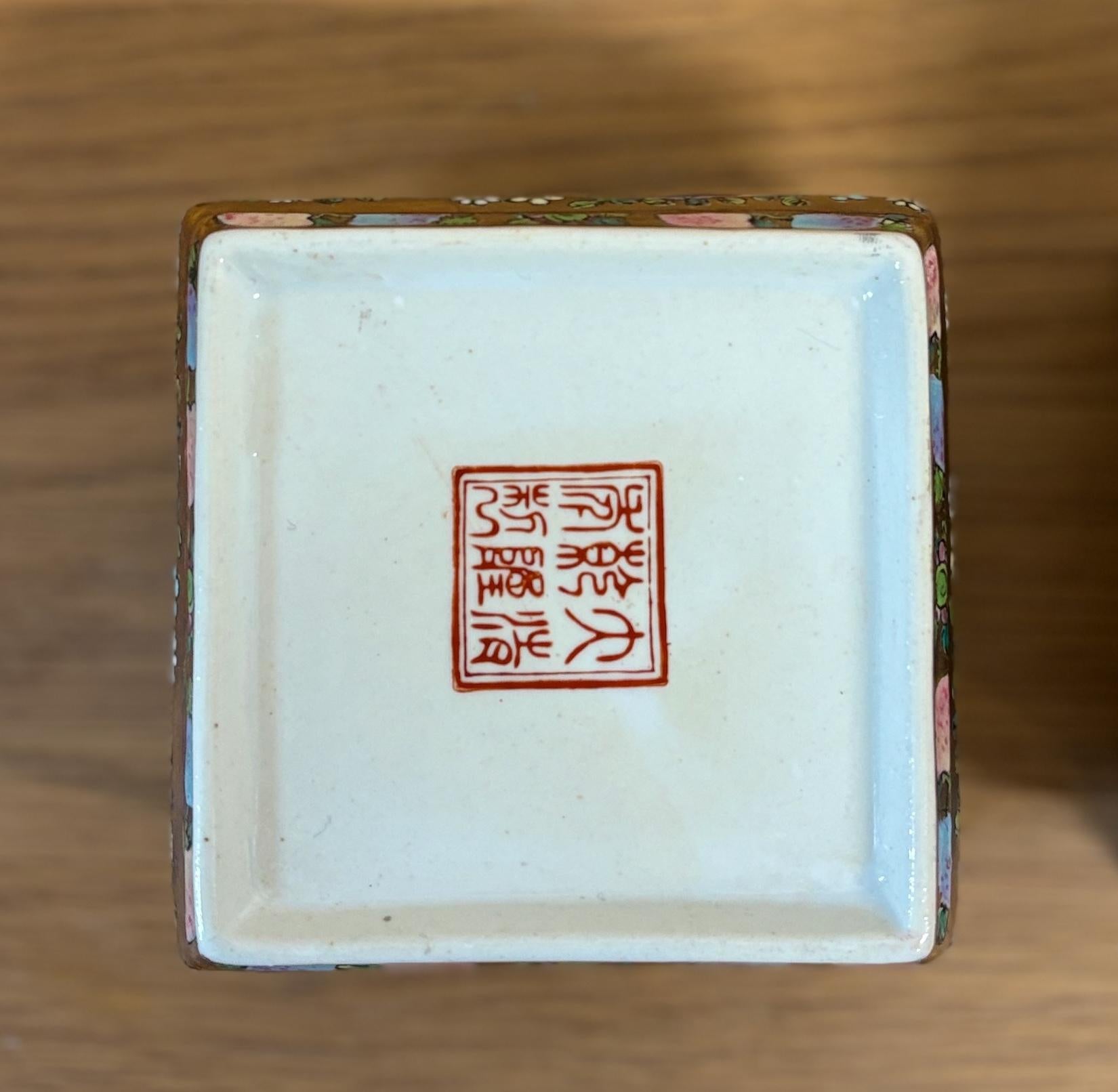 - Decoration: Famille rose enamels with gilt highlights; apocryphal Qianlong seal marks to bases