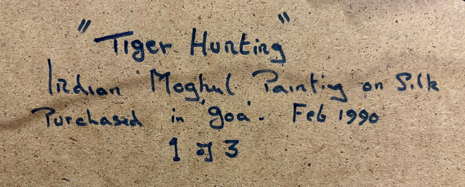 Pair of Mughal‑Style Silk Paintings, “Tiger Hunt”, India, c. 1985–1990